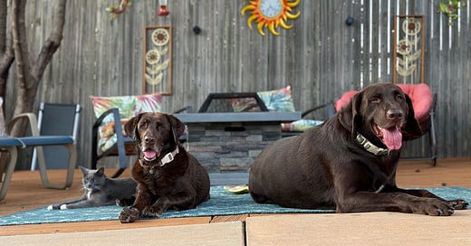 The sudden death of Storm, our 13 1/2-year-old chocolate lab who died one day after jumping into our swimming pool three different times and sitting for the picture above this column, in which she’s flanked by Sammi, our cat, and Franks, her 135-pound son.